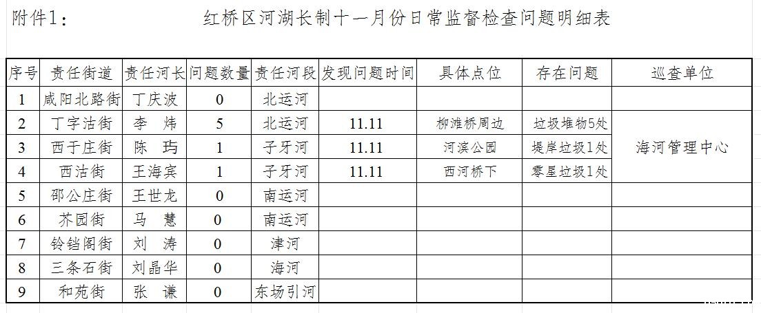 附件1:红桥区河湖长制十一月份日常监督检查问题明细表